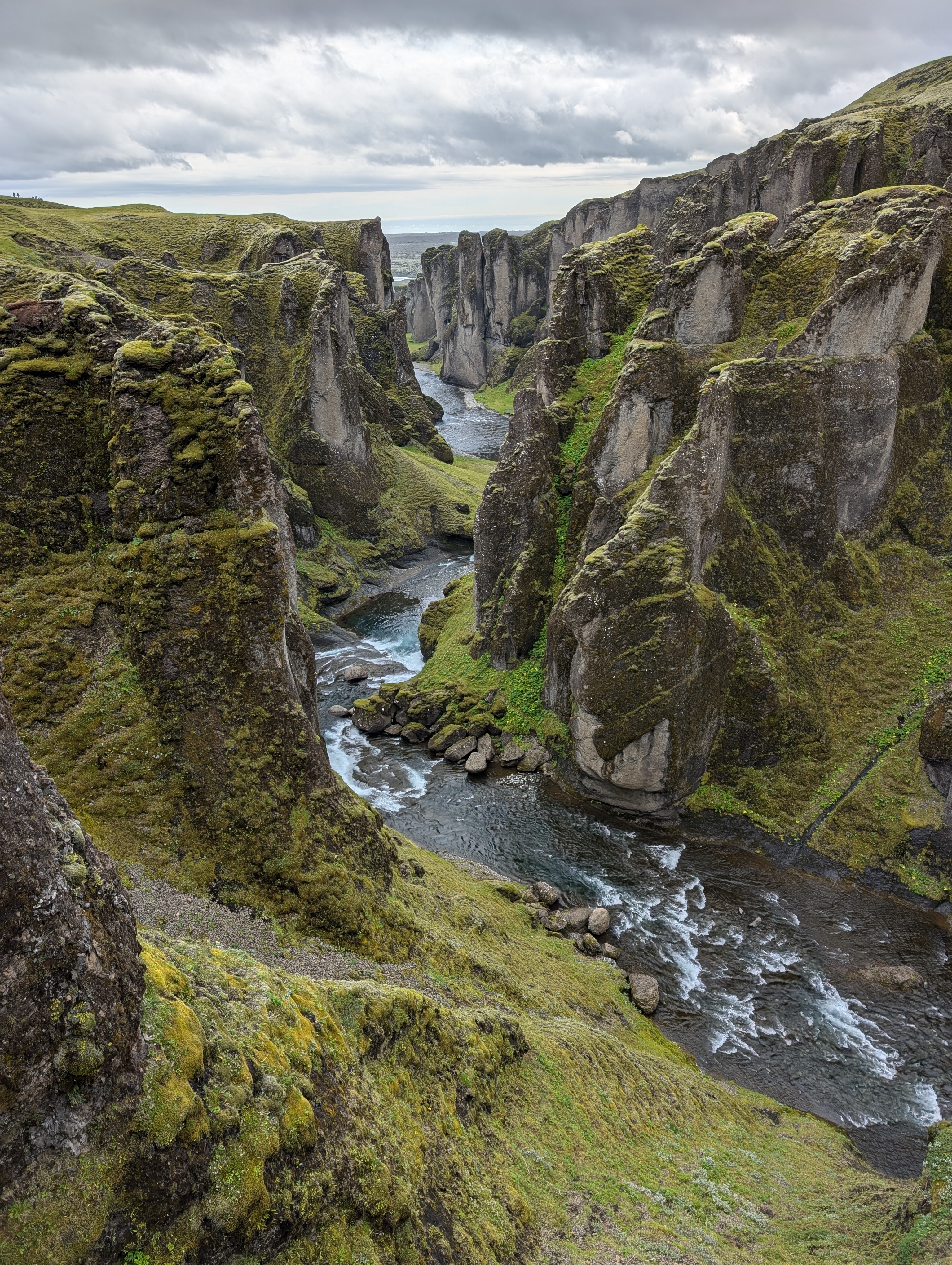 We got an early start as it is hard to sleep late when the sunrises at 4:30 am. Our first stop along the southern coast of Iceland was the Skogafoss waterfall which is 60 meters tall. Next we visited the Dyrholaey, an area along the coast with a lighthouse, jagged cliffs housing many bird species including Puffins and rock formations with arches. We then arrived in the town of Vik where we were to meet Arctic Adventures for an excursion into a natural ice cave in the Myrdalsjokull Glacier. Unfortunately, the tour was canceled due to gaseous pollution but we got no advance notice of the cancellation. We moved on with plenty of other sites to see. Next was the black sand beach and the Reynisdrangar basalt columns jutting out of the ocean and a sea cave. Heading further east we visited the Fjadrargljufur Canyon which included another amazing, spectacular, beautiful and lush gorge with a waterfall - a real “WOW” experience! From there we checked into Hotel Klauster in Kirkjubaejarklauster. Then we visited two more waterfalls and the “Church Floor,” an area of basalt columns, the tops of which are at ground level, which they compare to the hexagonal tiling of a church floor. Dinner at the hotel was great. I had the lamb roast which included a lamb springroll. Rosemary had the cod with a morel sauce. Another great day albeit at a slightly slower pace.